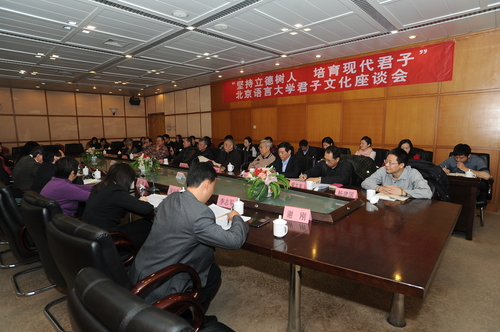 12月25日上午,以“坚持立德树人,培育现代君子”为主题的北京语言大学君子文化座谈会在会议中心第一会议室举行,李宇明书记、王鲁新副书记、刘伟副书记出席会议。以梁晓声教授为代表的北语专家学者与学工一线干部、关工委和青年学生代表,围绕君子文化的价值、培育君子文化的途径等问题各抒己见,探讨如何结合我校中外学生融合教育的实际,立足中华优秀传统文化和社会主义核心价值观,提炼北语校园文化,培育现代君子,为北语校园文化建设献计献策。