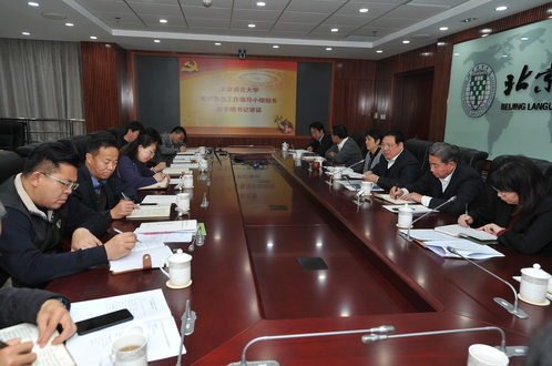 11月19日上午,北语意识形态工作领导小组第四次会议在综合楼909召开,会议的主题为“进一步加强宣传思想阵地建设”。李宇明书记出席会议并发表重要讲话。王鲁新副书记、刘伟副书记以及意识形态工作领导小组成员单位负责人、学校各级党组织负责人参加了会议。宣传部高金萍部长主持会议。