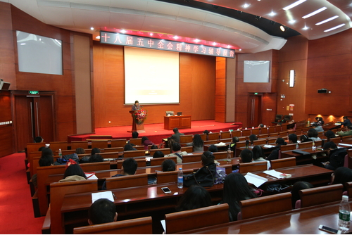 为深入学习贯彻十八届五中全会精神,11月20日下午,我校在逸夫报告厅举办报告会,财政部科研所研究员、政策实验室宏观部主任张鹏做了题为“面向十三五:四个全面与五大理念的新格局——十八届五中全会精神学习”的辅导报告。校领导、全校中层干部、全体教工党支部书记、学生党支部书记等参加报告会。报告会由刘伟副书记主持。2015级新生党员及入党积极分子培训班全体学员在分会场认真听取了辅导报告。